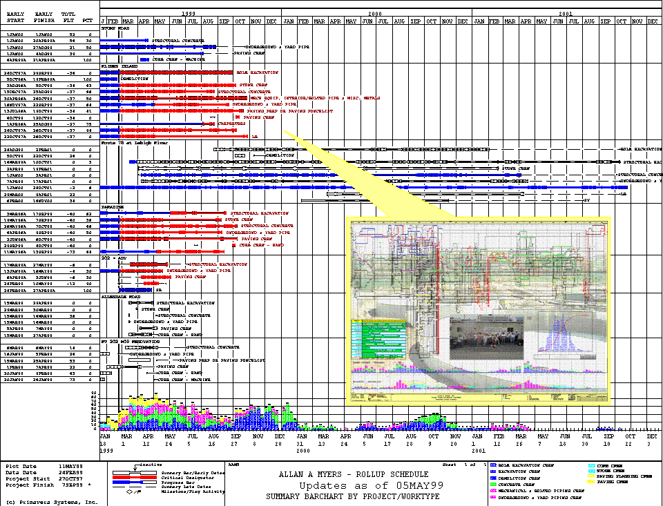 to forecast need for key equipment and personnel for the coming year. Schedules (CPM and less than CPM) were added to a Master System as acquired, (removed as completed,) summarized with