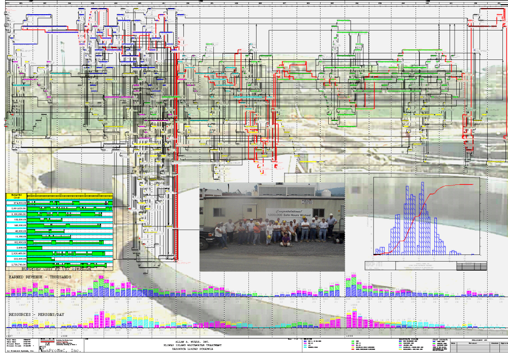 Kline's Island Wastewater Treatment Plant The specification did not demand resource and cost loading, but the team at Allen Myers wanted to provide a "best of class" CPM plan and schedule. Risk analysis indicated an achievable schedule with ample contingency to meet 80% likelihood of completion on time. Actual completion was even sooner - ahead of schedule and below estimated costs. This graphic presented at the Primavera User Conference and winning award for Best Time Scaled. |